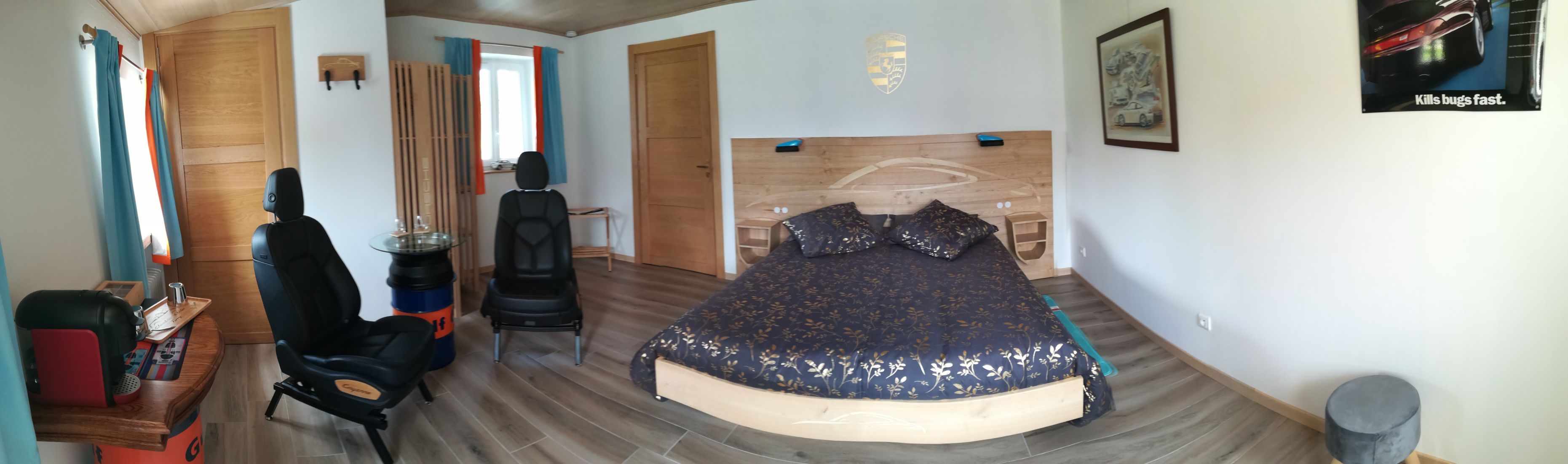 Venez découvrir nos chambres à la décoration personnalisée sur le thème de l'automobile sportive de la marque Porsche.